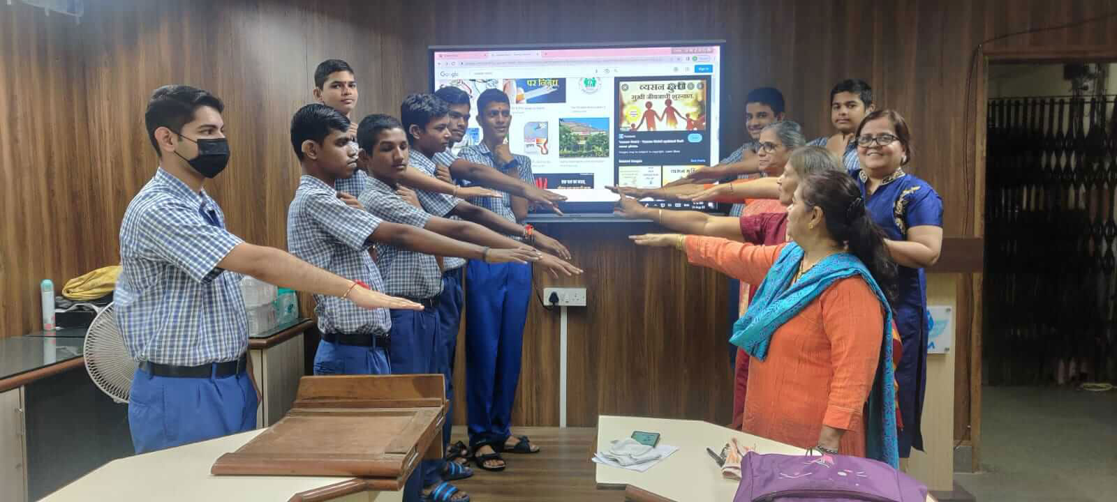 The programme organised by our R.T.T.School to know more about Divyanga students.Today we had visited Vivekananda Management College.We presented National Anthem, Pyramids,Drill and PPT. Dr.Satish Modh felicitated us.